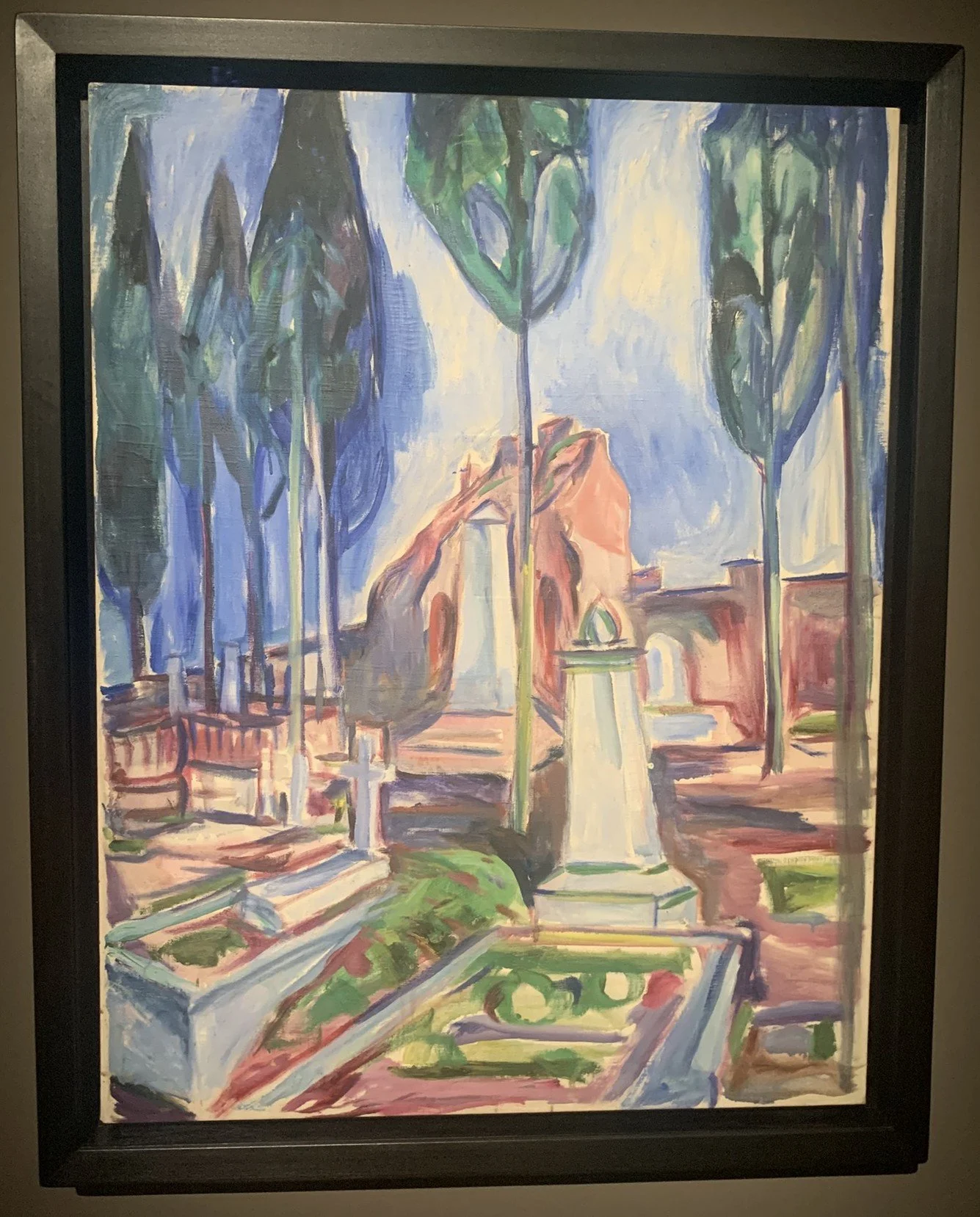 Lo scorcio del Cimitero acattolico dipinto da Edvard Munch, che include ovviamente la tomba dello zio, non espone i cipressi in modo cupo e inquietante. L’area cimiteriale appare immersa in una rosea luce mattutina. Più che un camposanto, sembra un giardino dove le tombe sono aiuole e i cipressi, custodi benevoli. Gli alberi non sono appesantiti da tinte scure; ogni esile tronco dirige verso l’alto la sua freccia iridescente a difesa dell’atmosfera meditativa del posto.