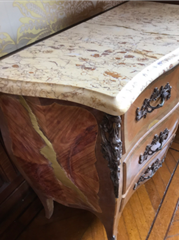 Non ho visto le vetrate di Sarkis ma mentre attraversavo una sala, ho notato una grande didascalia dove figurava in grassetto il nome dell’artista: Intrigata, mi sono soffermata. Sembrava che l’opera consistesse nel restauro di un vecchio comò danneggiato.